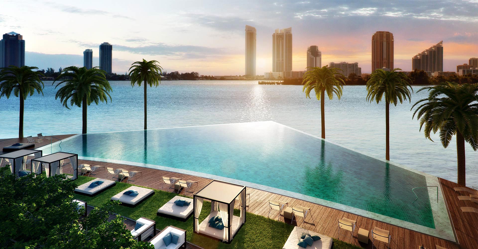 Bayfront infinity-edge pool with views of the Atlantic Ocean