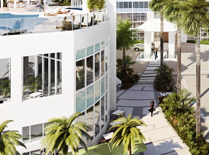 Lushly landscaped entrance plaza with fountain and iconic porte-cochère