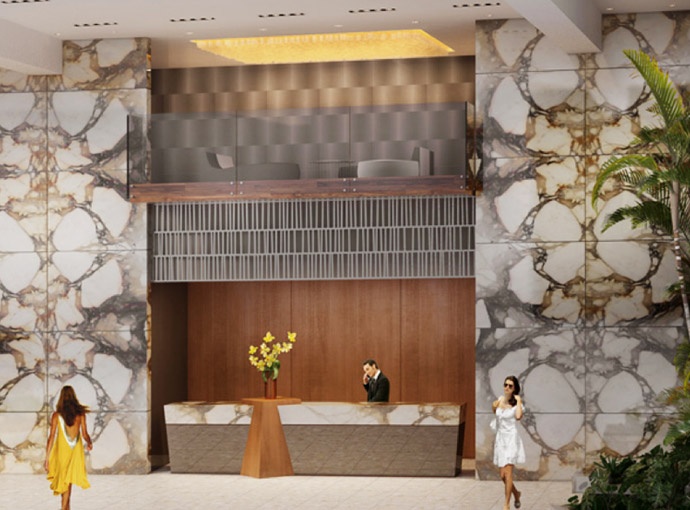 Grand lobby with 30 foot high ceilings and individual elevator banks