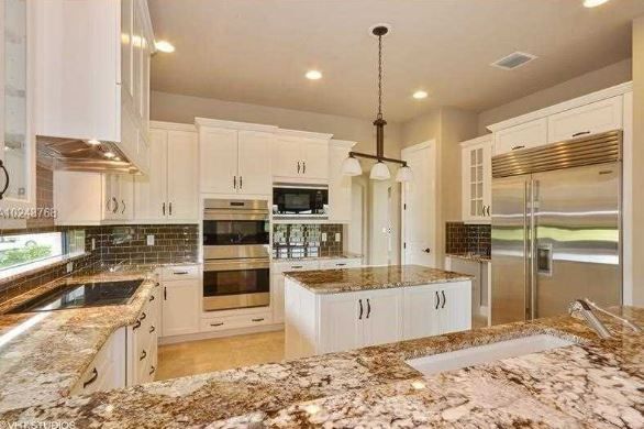backsplash, granite, and cabinets, island, and top-of-the-line Sub-Zero stainless steel
