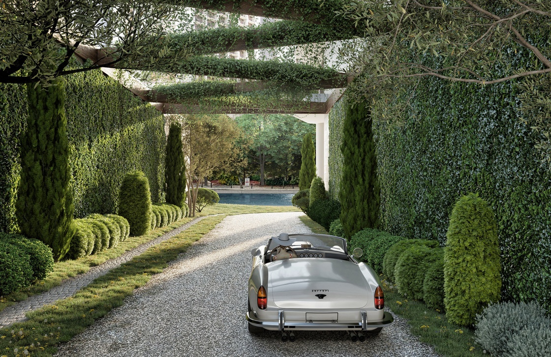 Lushly landscaped secluded private entrance leading to the riverfront arrival court and elegant porte-cochère entrance
