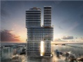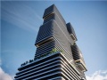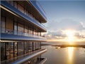 - Floating vanity with Gioia marble countertops and fluted slate-gray walnut inlay doors, and custom emblem toilet