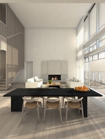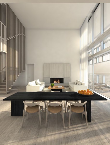 • John Pawson custom designed feature wall with cantilevered concrete bench and built-in sliding bleached oakwood panels to conceal flat screen television