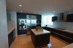 Snaidero wood and glass kitchen cabinets with granite countertops and stainless steel backsplashes
